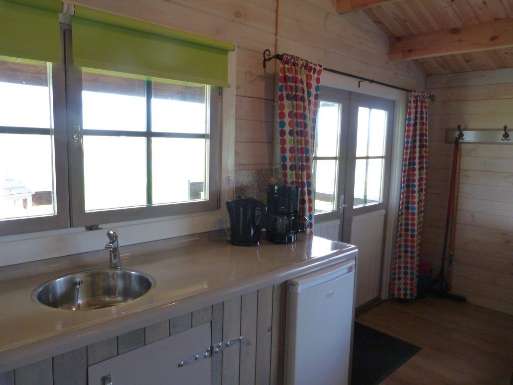 Inside cabin Waterral there is a lot of space since it is one big room of 5 x 5 metres. In this cabin there’s 1 bunk bed (for kids) and 2 single boxspring beds. Quilts and pillows are present in the cabin. In this room you will find a toilet, a small kitchen, and a table with 4 chairs. In the kitchen there is a fresh water tap, a coffee maker and electric kettle, a fridge with freezer and a small camping-stove. Pottery and tableware are free to use. At the veranda you can enjoy a nice sunset, sitting at a picknick-table. Showers are for free in the sanitary building on the campsite.