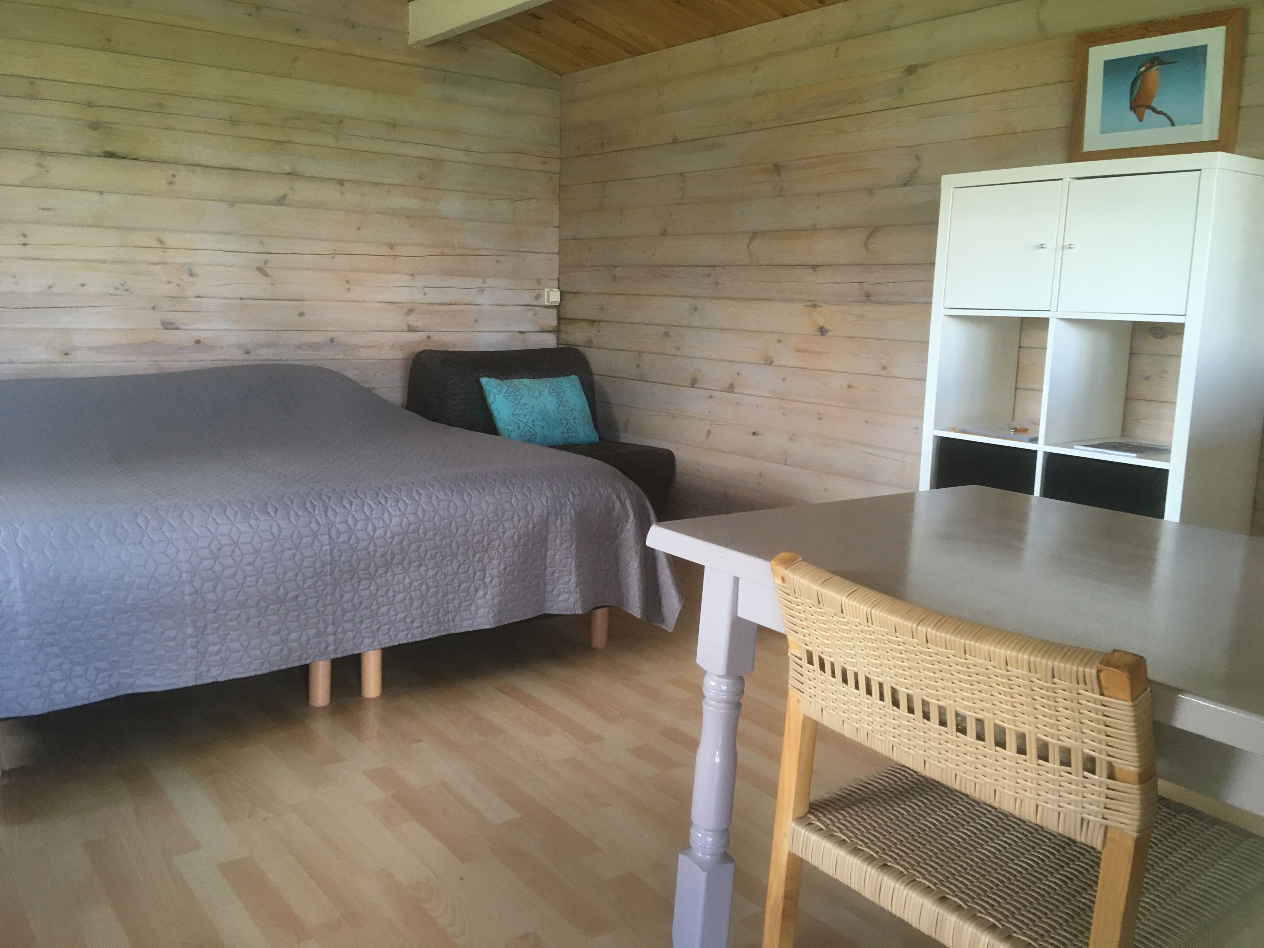 In Blokhut IJsvogel staan twee eenpersoons-boxspringbedden met dekbedden en kussens, twee fauteuils, een eethoek en op de veranda staat een picknicktafel voor u klaar.